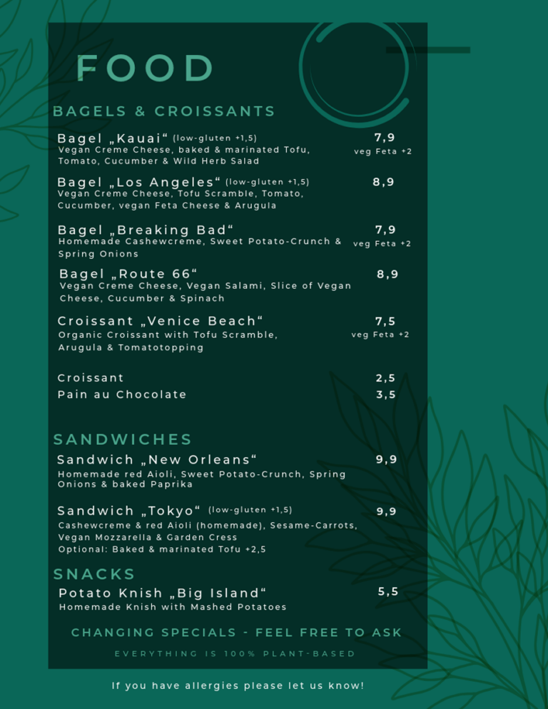 Take a look at our food and drink menus. Our changing cake selection can be found in our display case at the counter.Food and drinks can also be ordered there.